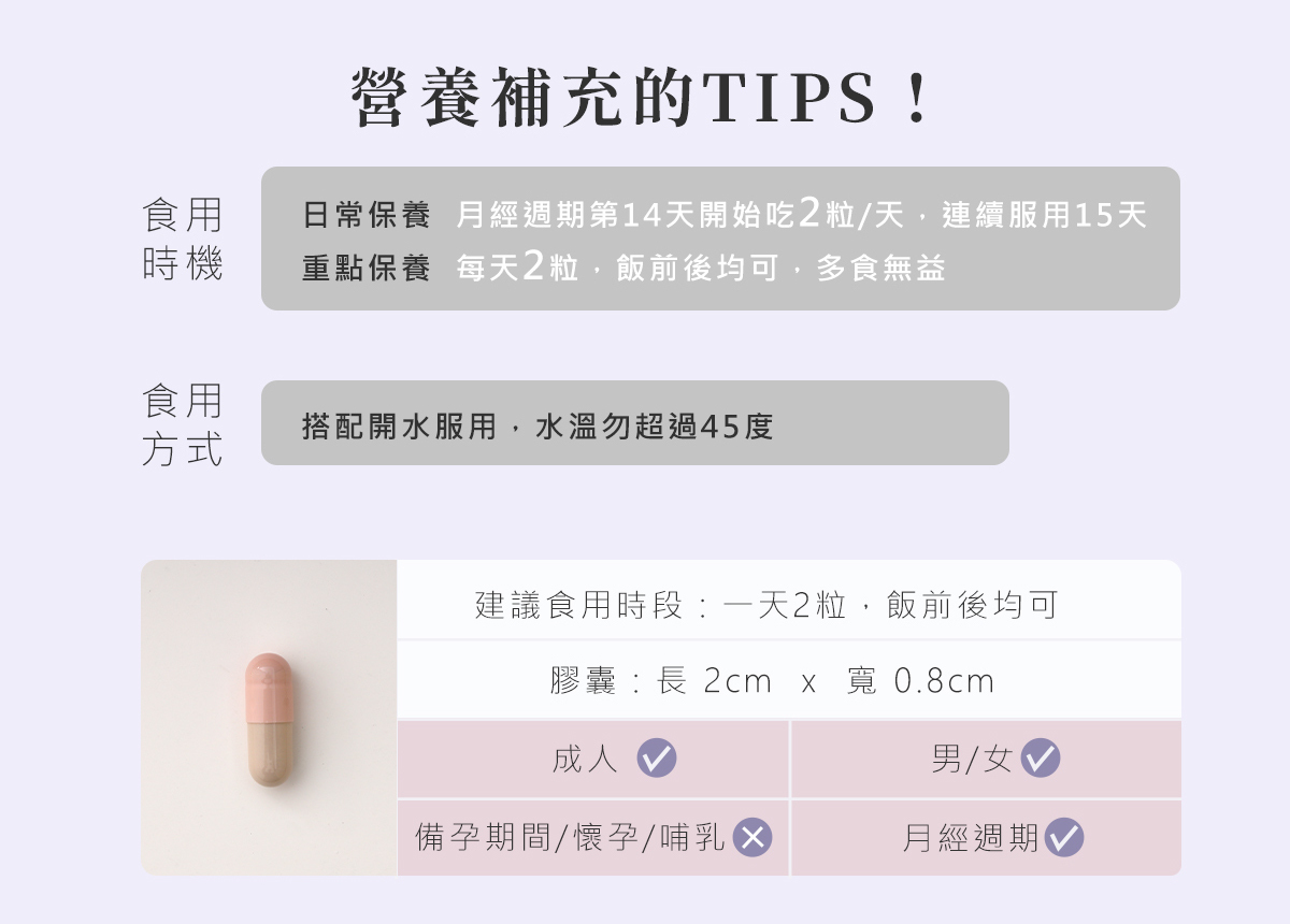 ▫ 日常保養:月經週期第14天開始2粒/天,連續服用15天